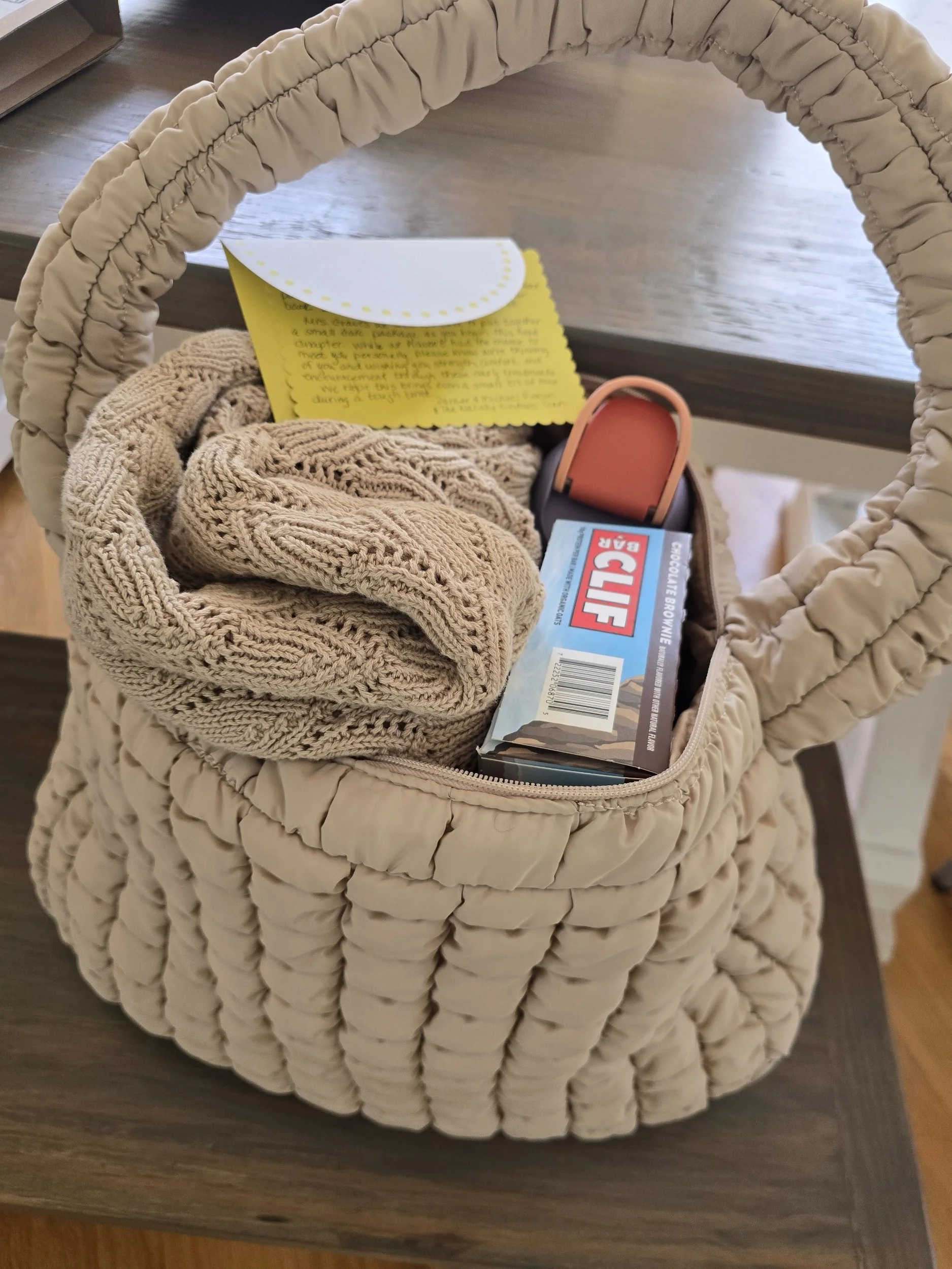 A sweet “chemo care kit” from Wallaby Windows of Coastal Carolina which just did our window installation in the living room