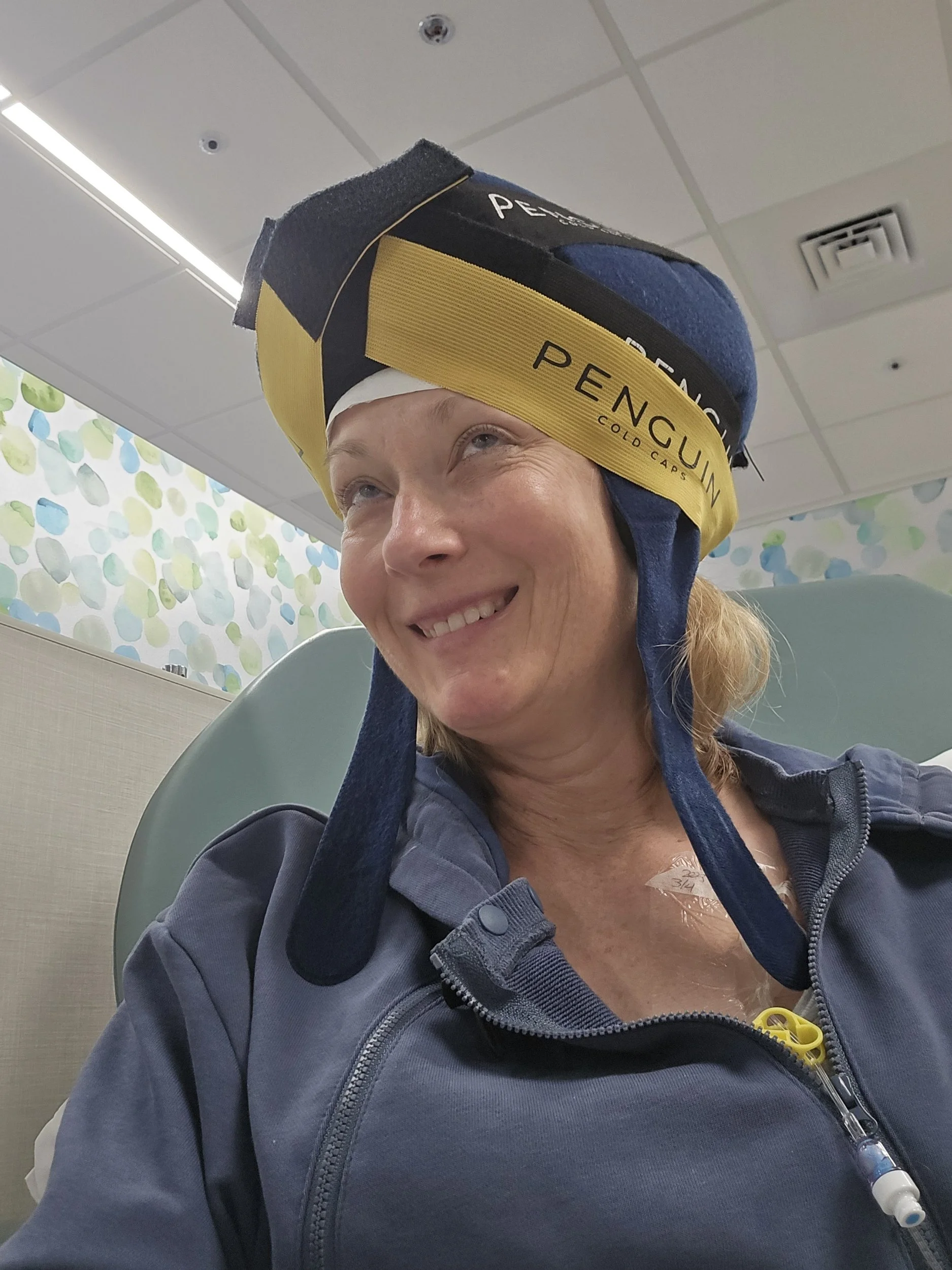 In good news, I still have my hair, though it has thinned some. Dr. Robinson said most people have lost all their hair by this point, so Penguin Cold Capping does seem to be working for me!