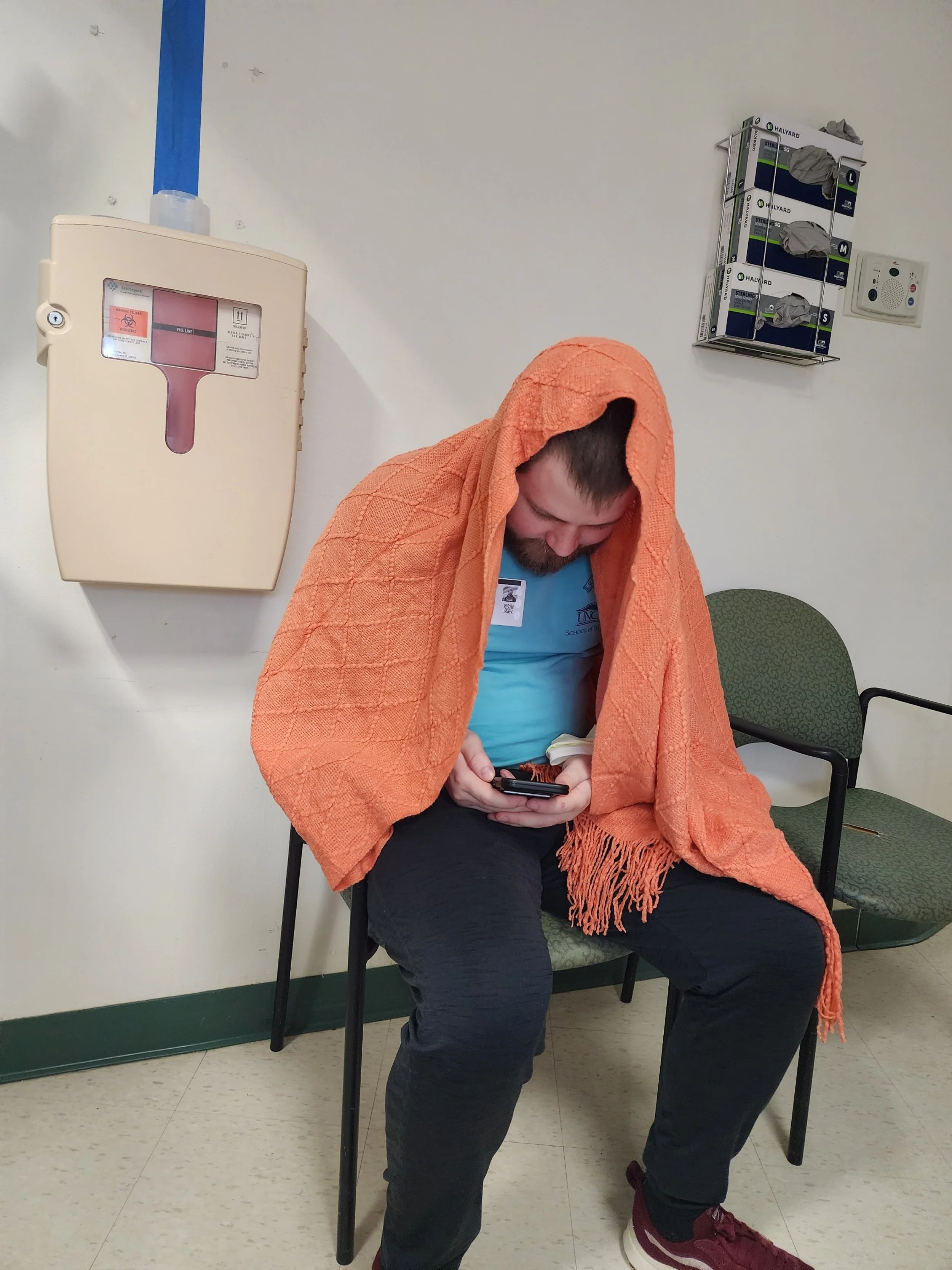 Ethan has been a great help to me, even staying overnight. It’s been good having him here and seeing him put his professional skills into action on a personal level (and he really likes this blanket Elizabeth gave me).